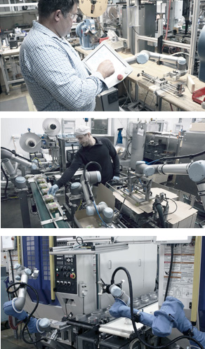 Nowyou can replace human operators in dirty, dangerous, and dull jobs to reducerepetitive strain and accidental injuries. Eighty percent of the thousands ofUR robots worldwide operate with no safety guarding (after risk assessment),right beside human operators. The safety system of our robots is approved andcertified by TÜV (The German Technical Inspection Association).